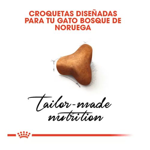 Norwegian Forest Cat Adult de Royal Canin® ha sido formulado teniendo en cuenta las necesidades específicas de los gatos de raza Bosque de Noruega. Su croqueta en forma de estrella de tres puntas específicamente diseñada está adaptada a la fuerte mandíbula de los gatos de raza bosque de Noruega y estimula la masticación, favoreciendo la higiene oral. El denso pelaje del bosque de Noruega consiste en una capa de pelo superior, repelente al agua, y un denso subpelo lanoso que le sirve de aislamiento. El exclusivo complejo de nutrientes de Norwegian Forest Cat Adult de Royal Canin® ayuda a fortalecer la función barrera de la piel manteniendo la salud de la piel y el buen estado del pelo. Una combinación específica de fibras ayuda a estimular de forma natural su tránsito intestinal, así como a reducir y controlar la formación de bolas de pelo. Los Bosque de Noruega como el tuyo tienen un crecimiento lento y cuando ya han alcanzado su edad adulta, a los 4 o 5 años, normalmente son mucho más grandes que los gatos normales. El macho puede llegar a pesar hasta 9 kg. Los Bosque de Noruega son gatos de estructura ósea robusta, con cuerpos musculosos, potentes y atléticos. Por eso, Norwegian Forest Cat Adult de Royal Canin® aporta una fórmula adaptada para mantener su peso ideal, favorecer la salud de las articulaciones y fortalecer los huesos. Este alimento también está enriquecido con L-carnitina, nutriente que participa en la metabolización de las grasas. En Royal Canin®, nos comprometemos a proporcionar soluciones nutricionales adaptadas a las necesidades de tu mascota. Sometemos todos nuestros productos a un minucioso proceso de control de calidad para garantizar las propiedades óptimas de los alimentos, así como para satisfacer las necesidades nutricionales y el estilo de vida específicos de tu gato. Esto significa que, cuando alimentas a tu gato con Norwegian Forest Cat Adult de Royal Canin®, le estás proporcionando una dieta completa y equilibrada.