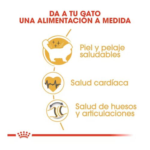 El alimento Ragdoll Adult de Royal Canin® ayudará a mantener la piel saludable y el pelaje nutrido de tu gato a través de una combinación de nutrientes específicos incluyendo aminoácidos, vitaminas y ácidos grasos omega-3 y omega-6. Contiene una cantidad concentrada de taurina para ayudar a mantener una función cardíaca saludable para su gato Ragdoll. Físicamente exigente, por lo que Ragdoll Adult de Royal Canin® está diseñado con un enriquecimiento de EPA y DHA (que se encuentran en el aceite de pescado) para ayudar a mantener huesos y articulaciones saludables. La salud urinaria también es un beneficio principal del alimento Ragdoll de Royal Canin®, con un equilibrio de minerales especialmente diseñado para ayudar a mantener el sistema urinario saludable de su gato, lo que permite fomentar la masticación y apoyar la higiene bucal.