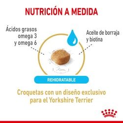 Más información Piel y pelaje saludables El pelo del Yorkshire Terrier es conocido por su continuo crecimiento y por su suavidad natural. Esta fórmula exclusiva ayuda a mantener la salud del largo pelaje del Yorkshire Terrier. Enriquecido con niveles precisos de ácidos grasos omega 3, ácidos grasos omega 6, aceite de borraja y biotina. Salud digestiva Una fórmula equilibrada de forma precisa que ayuda a mantener una salud digestiva óptima. Contiene proteínas altamente digestivas (L.I.P.*), una mezcla de prebióticos y fibras para favorecer una flora intestinal equilibrada y a una calidad óptima de las heces. *Proteína seleccionada por su muy elevada digestibilidad. Croqueta a medida / altamente palatable / rehidratable La forma, el tamaño, la textura y la fórmula se adaptan a la pequeña mandíbula del Yorkshire Terrier maduro. Esta fórmula contiene quelantes de calcio que protegen su salud dental. Se puede reblandecer la croqueta con agua caliente, lo que resalta su aroma y hace que se pueda comer más fácilmente. COMPOSICIÓN: harina de maíz, proteínas de ave deshidratadas, gluten de trigo*, arroz, grasas animales, maíz, gluten de maíz, hidrolizado de proteínas animales, fibras vegetales, pulpa de remolacha, minerales, aceite de pescado, aceite de soja, levadura de cerveza, pulpa de tomate deshidratada (fuente de licopeno), fructo-oligosacáridos, hidrolizado de levaduras (fuente de manano-oligosacáridos), aceite de borraja (0,1 %), hidrolizado de crustáceo (fuente de glucosamina), extracto de rosa de la India (fuente de luteína), hidrolizado de cartílago (fuente de condroitina). Aditivos nutricionales: Vitamina A: 29000 UI, Vitamina D3: 800 UI, Hierro (3b103): 43 mg, Yodo (3b201, 3b202): 4,3 mg, Cobre (3b405, 3b406): 13 mg, Manganeso (3b502, 3b504): 55 mg, Zinc (3b603, 3b605, 3b606): 135 mg, Selenio (3b801, 3b811, 3b812): 0,09 mg - Aditivos tecnológicos: Clinoptilolita de origen sedimentario: 5 g - Aditivos organolépticos: Extracto de té (fuente de polifenoles): 150 mg - Conservantes - Antioxidantes. Proteína bruta: 29,0 % - Grasa bruta: 18,0 % - Ceniza bruta: 5,0 % - Fibra bruta: 2,9 % - Fósforo: 0,53 % - Ácidos grasos omega 3: 0,68 % - Ácidos grasos omega 6: 3,39 % - Biotina: 3,08 mg/kg - Trifosfato pentasódico: 3,5 g/kg. Proteína bruta: 29,0% - Grasa bruta: 18,0% - Ceniza bruta: 5,0% - Fibra bruta: 2,9% - Fósforo: 0,53% - Ácidos grasos omega 3: 0,68% - Ácidos grasos omega 6: 3,39% - Biotina: 3,08 mg/kg - Trifosfato pentasódico: 3,5 g/kg. *L.I.P.: proteína seleccionada por su elevada digestibilidad. Modo de empleo: ver tabla.N de lote, n de registro y fecha de utilización preferente: ver en el envase.Conservar en lugar fresco y seco.